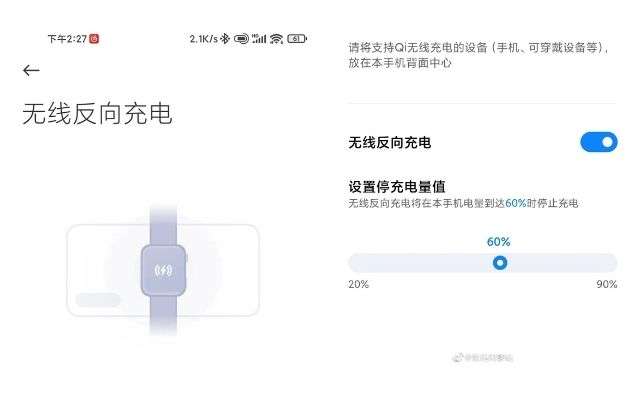 La foto mostrata di seguito condivisa da Digital Chat Station è uno screenshot proveniente da una recente versione per sviluppatori di MIUI. Il testo cinese in alto recita “Ricarica inversa wireless” e poi mostra un orologio posizionato sul retro dello smartphone Mi.