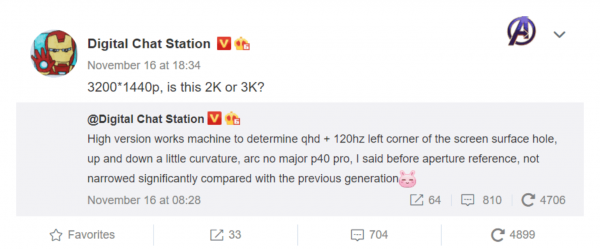 Dopo segnalazioni secondo cui lo Xiaomi Mi 11 Pro arriverà con uno schermo 2K con refresh rate a 120Hz, oggi l’ultimo rumor mostra che questo display potrebbe effettivamente essere più di 2K, molto probabilmente 2K +. Ad affermarlo è il celebre leaker @DigitalChatStation, secondo cui la risoluzione del pannello del Mi 11 Pro potrebbe essere 2K o 3K, definito quest’ultimo anche 2K+