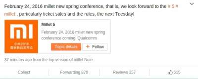 Continuano a trapelare indiscrezioni relative al nuovo Xiaomi Mi 5, prossimo top di gamma del produttore cinese. In base alle ultime informazioni pubblicate su Weibo, noto portale di microblogging cinese, il dispositivo verrà ufficializzato a fine febbraio, in occasione dello Sprint Festival, il capodanno cinese. A dare la conferma è lo stesso Liwan Jiang, vicepresidente della società, preannunciando la conferenza stampa che si terrà il 24 febbraio 2016 a Pechino, dedicata al nuovo flagship.