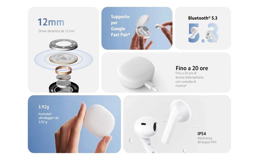 Le cuffie di Xiaomi, infatti, garantiscono fino a 5 ore di utilizzo con una singola carica e fino a 20 ore di utilizzo considerando la carica aggiuntiva della batteria. C’è la certificazione IP54 ed è disponibile anche il supporto Google Fast Pair per il collegamento rapido con gli smartphone Android.