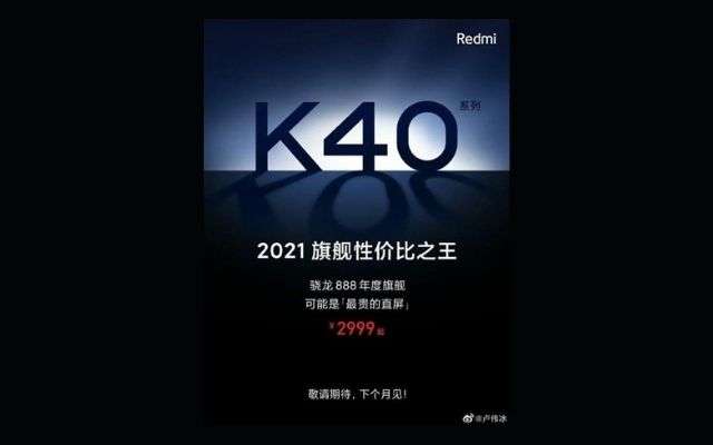 Secondo il direttore generale del marchio Redmi, nonché vicedirettore di Xiaomi Group, Lu Weibing, i nuovi modelli della serie Redmi K40 arriveranno il mese prossimo. Sappiamo che ci saranno almeno due versioni alimentate dai nuovi chip Snapdragon 888 e Snapdragon 870. Oltre a questo, abbiamo anche letto in rete che il prezzo del telefono sarà di circa 2999 yuan (alias, 434 dollari). Stando a quanto emerso, pare che la serie K40 possa approdare sul mercato il prossimo 25 febbraio 2021.
