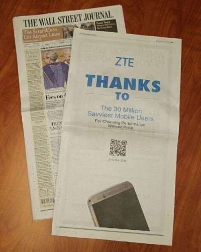 Ieri però ZTE ha mostrato per la prima volta l’apparecchio più o meno ufficialmente. L’azienda ha, infatti, acquistato un’intera pagina pubblicitaria sul Wall Street Journal per ringraziare la sua base utenti americana – che ammonta straordinariamente a 30 milioni di persone – e nello stesso annuncio, in calce, ha mostrato l’angolo di uno smartphone che ha proprio le sembianze del prossimo Axon 7. Che sia effettivamente questo smartphone non ne siamo sicuri, però ci sono buone probabilità che lo sia davvero. L’annuncio riporta anche un QR Code e una URL (www.zteusa.com) che dovrebbe indicare la stessa pagina su cui si arriva scansionando il codice. Non ne abbiamo certezza, ma questa micro campagna pubblicitaria potrebbe significare che il il dispositivo sarà lanciato inizialmente negli Stati Uniti (come avvenne con il primo modello di smartphone a brand Axon).