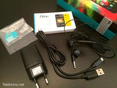 La confezione di vendita contiene, oltre ad un manuale di istruzioni multilingue, un caricabatteria con porta USB, un cavo dati USB/microUSB, una cuffia auricolare stereo di tipo tradizionale con tasto di risposta (di qualità abbastanza economica) ed una serie di adattatori per SIM card.